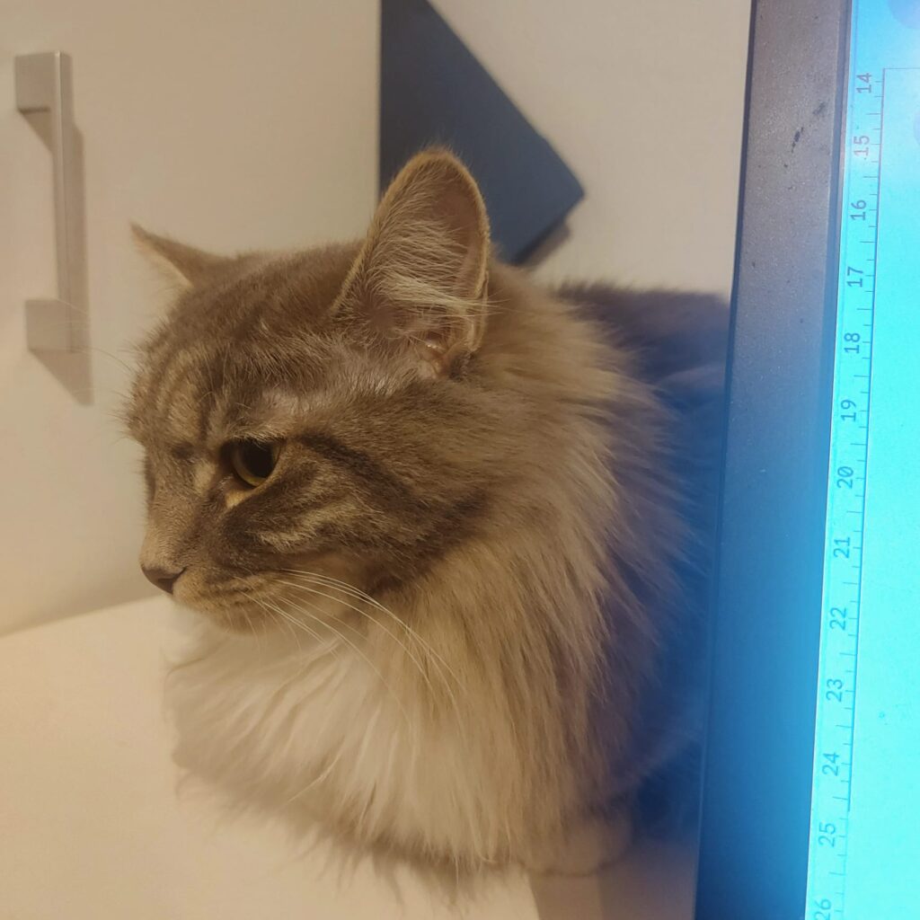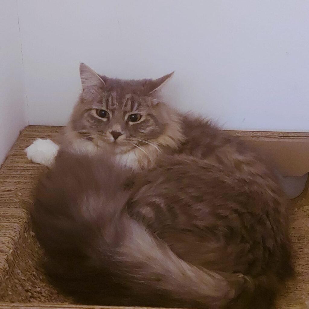 Etna urodziła się 10.12.2023. Jest kotką niebieską z pręgowaniem tygrysim i bielą, którą widać na skarpetkach oraz pięknej, puchatej kryzie.